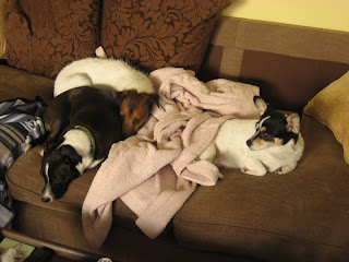 After all that the dogs were pretty pooped. But, since we ended up being gone for about 8 hours today they were really crazy when we got home! After some potty time in the yard and some dinner in their bellies they have all finally calmed down and are now sleeping in the living room while we're relaxing and watching some t.v. Four dogs doesn't seem like that many when they're all being so good :D